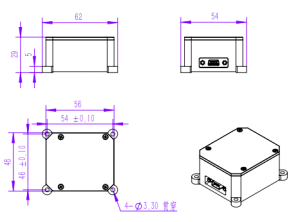 The dimensions of the AHRS module are 56 mm × 48 mm × 29 mm. The external structure of the AHRS module is shown in Figures 1 and 2 below.